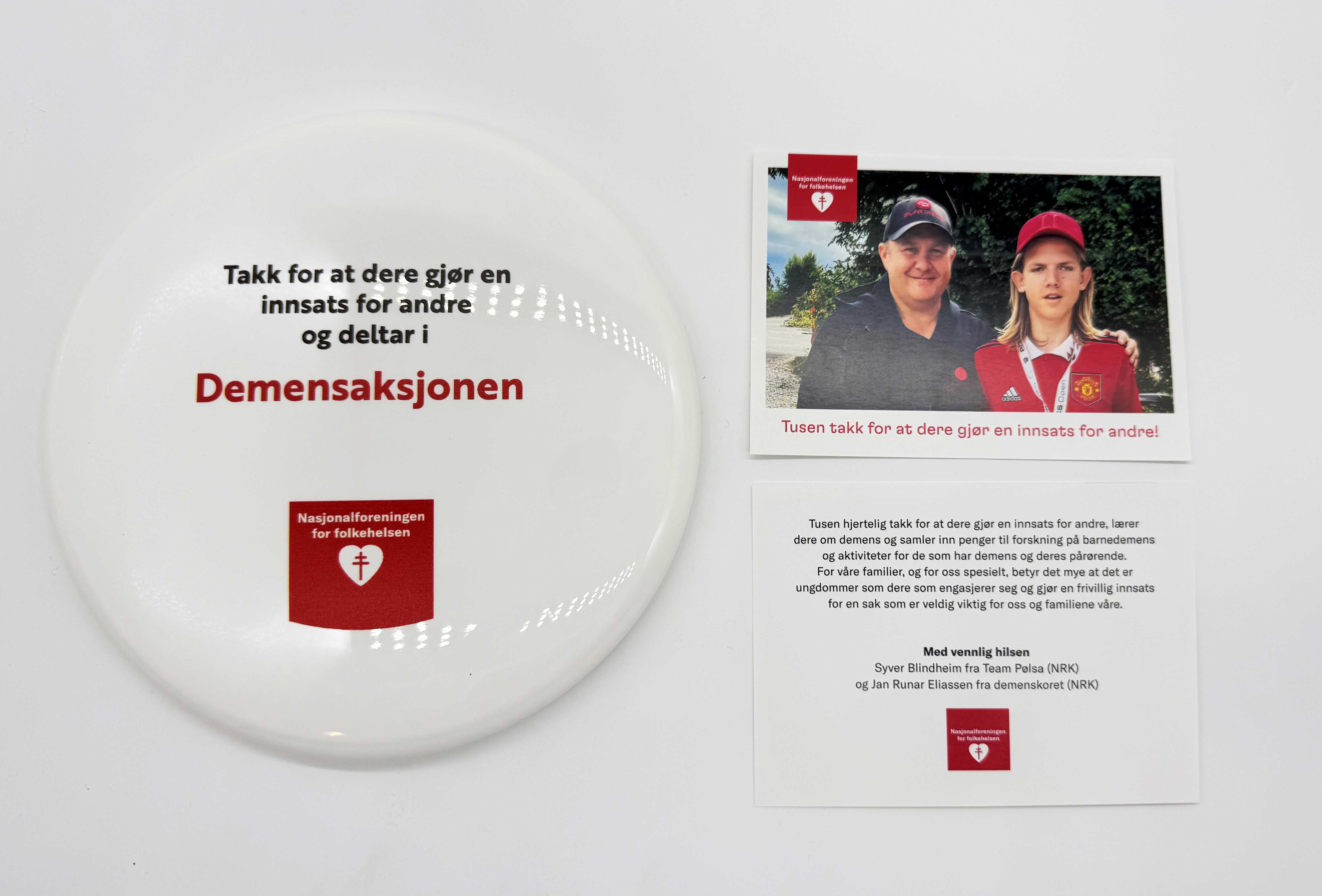 Meld dere på Demensaksjonen og få en gratis frisbee med hilsen fra Syver i Team Pølsa og Jan Runar i Demenskoret, begge på NRK. Bak dem står også begge familiene.